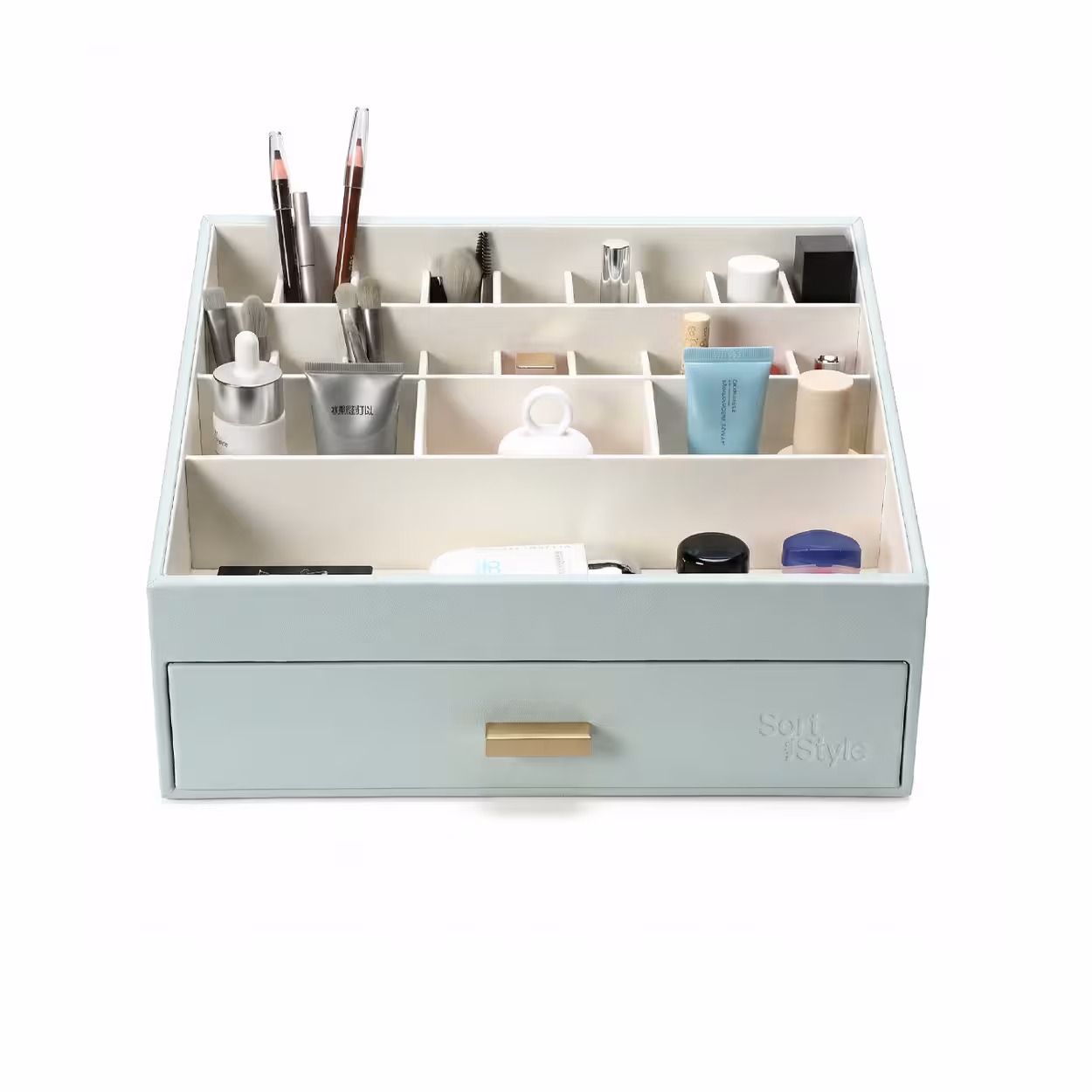 A luxury aqua color makeup organizer created to make getting ready feel intentional and enjoyable. It keeps your favorite products beautifully arranged with a thoughtful design that takes care of the organization for you, turning everyday makeup into a moment you actually look forward to.